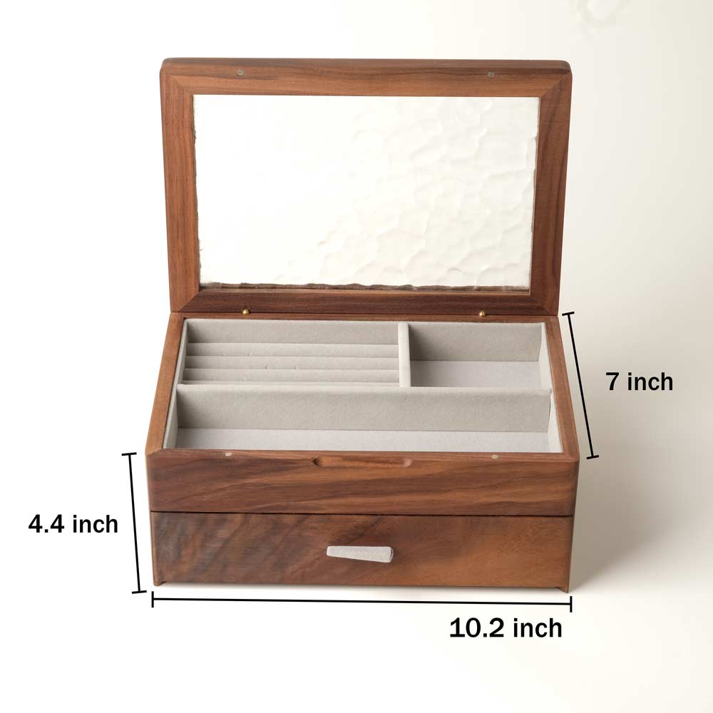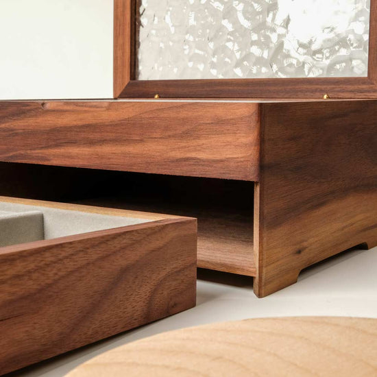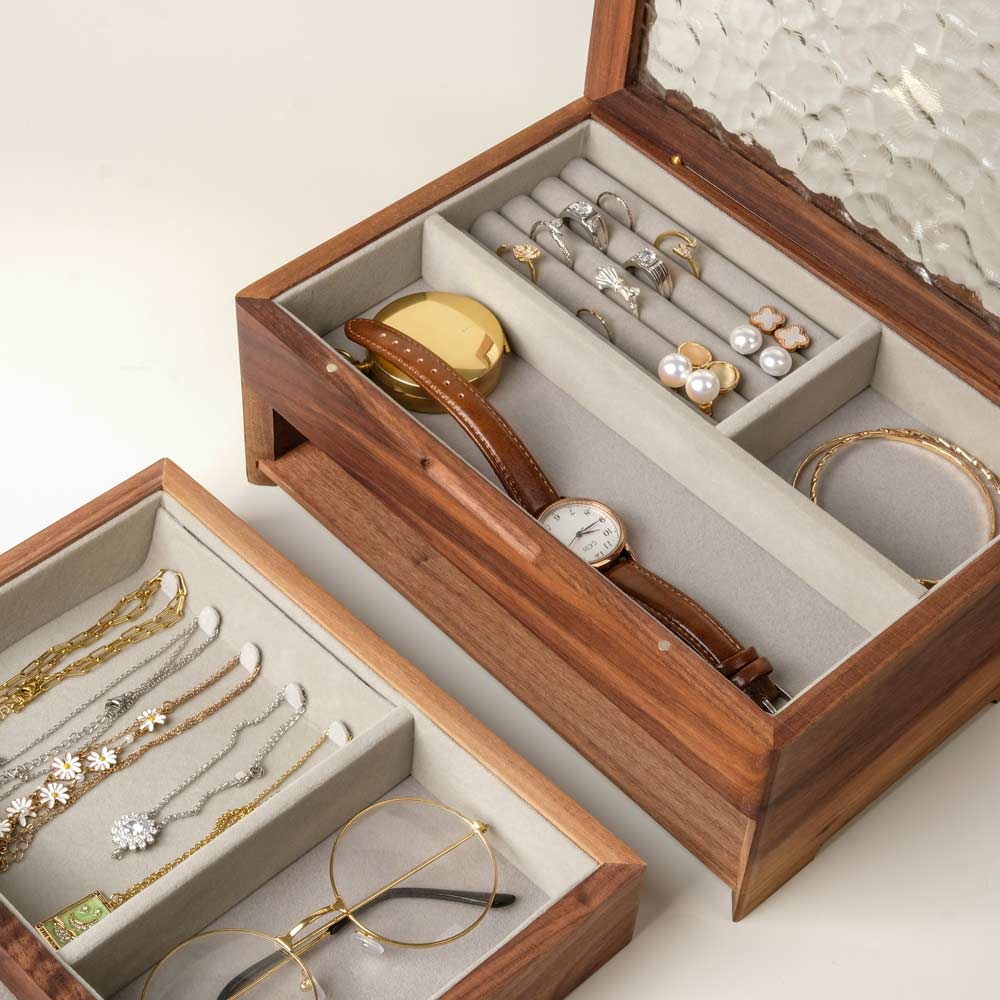 The Elegant - Double Tier Walnut Jewelry Box with Rippled Glass