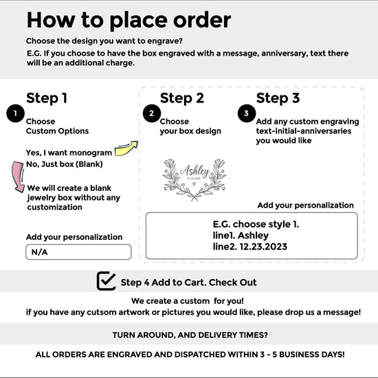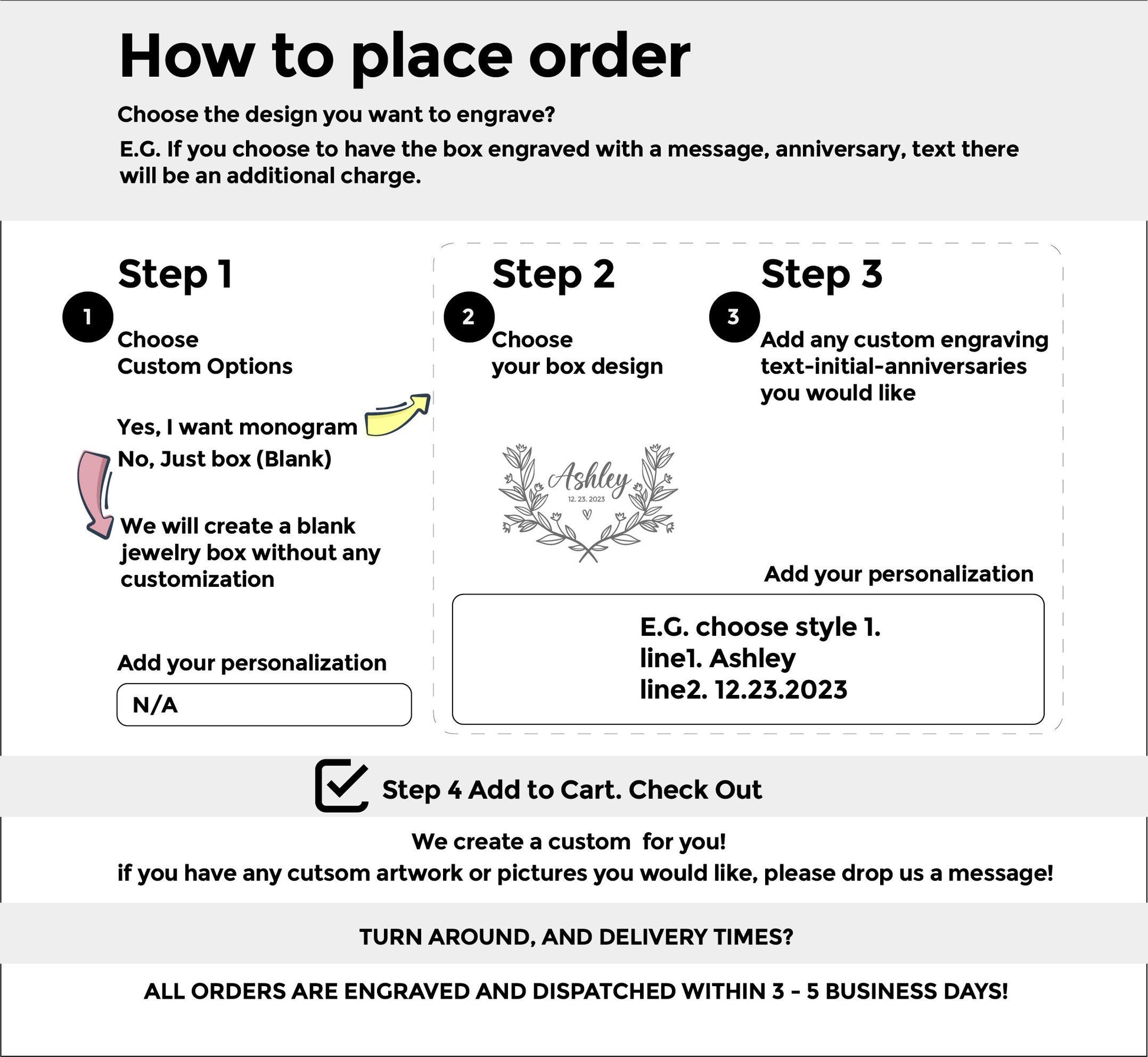 We offer 12 months of flowers and different design styles, you can personalize your jewelry box by adding initials, name, monogram, date or custom message.
