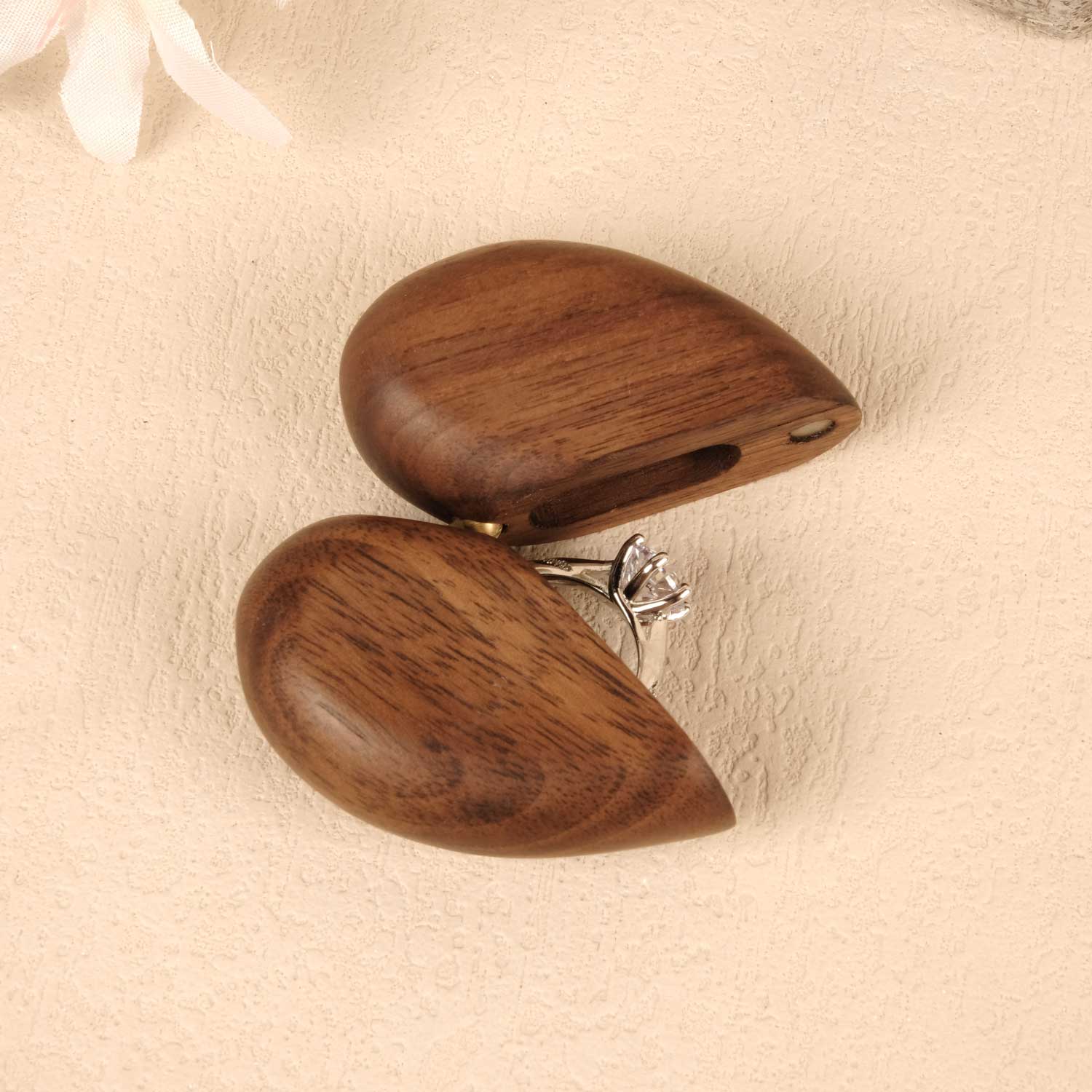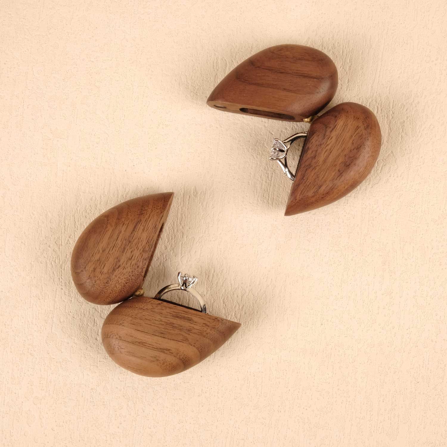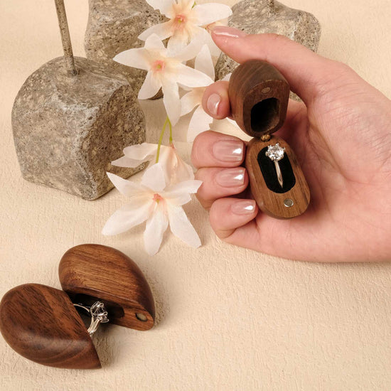 Our material——Walnut, was born natural amidst refreshing environment, gifted from the works of God. Every wooden ring box presents varied grain as time had already curved different traces within.