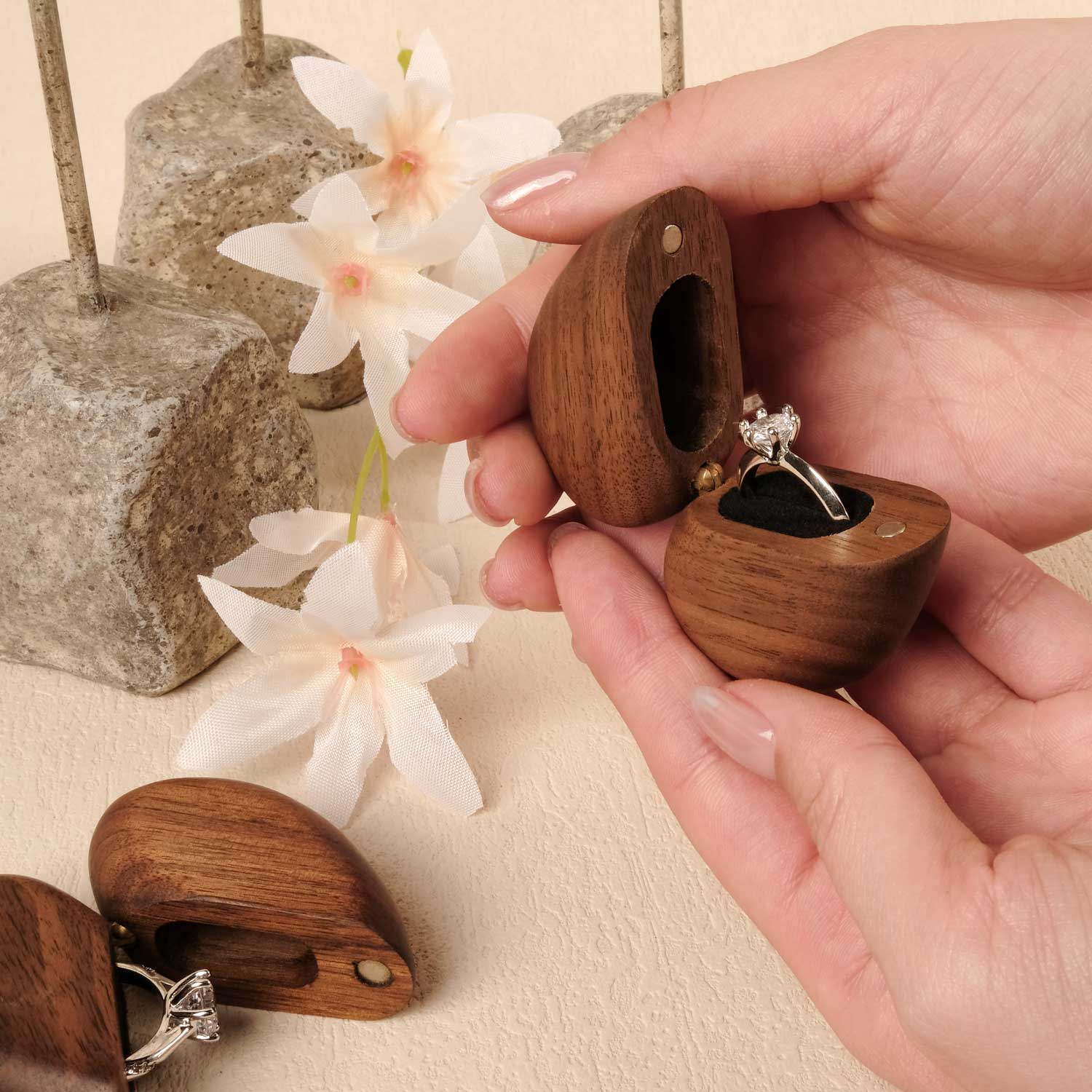 There exist no identical wood grain in any two pieces, which made your wooden ring box exactly unique among any others.
